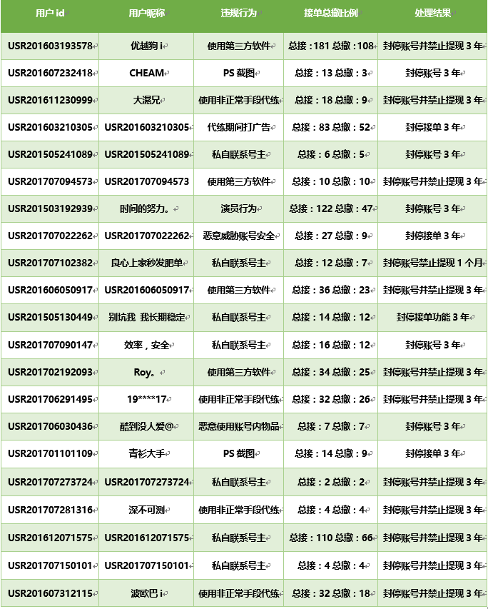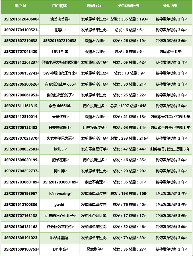 現將近期(2017年7月15日-2017年7月31日)違反平臺規定,擾亂交易秩序的部分用戶進行公示。