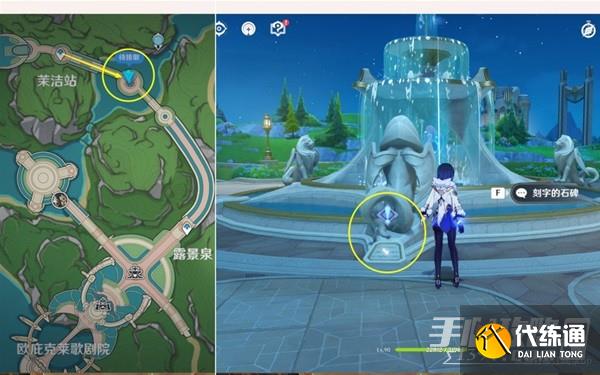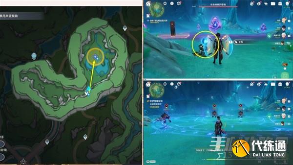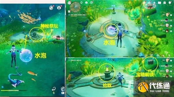 (3)打掉上圖的2個【紫色物體】后,會出現一個水泡,然后再長按E技能,將水泡移動到下圖【神秘祭壇】的我圖中位置后,再用普通攻擊打掉水泡,共鳴【神秘祭壇】周圍3個機關后完成該處解密,同時右邊寶箱解鎖,最后拾取【神秘祭壇】這里第2個【淚滴之鑰】后,該階段任務結束
