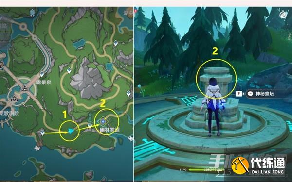(2)然后追蹤任務先去任務點1后,再去任務點2【神秘祭壇】位置,和【神秘祭壇】交互后,需要去周圍3處地方完成解密,3處地方的具體解密大家可以查看下面的視頻解說攻略,完成3處地方的解密后,再回到【神秘祭壇】這里拾取第1個【淚滴之鑰】后,該階段任務結束