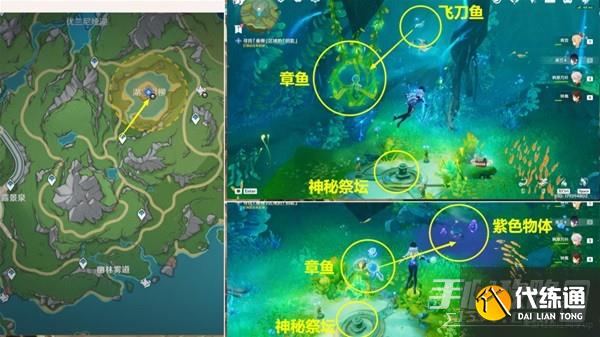(2)傳送到下圖位置,去水下完成解密,先獲得飛刀魚的能力,解救章魚,然后再獲得章魚的能力后,去打了右前方下面的2個【紫色物體】,【紫色物體】先打小的再打大的,長按E技能即可打掉