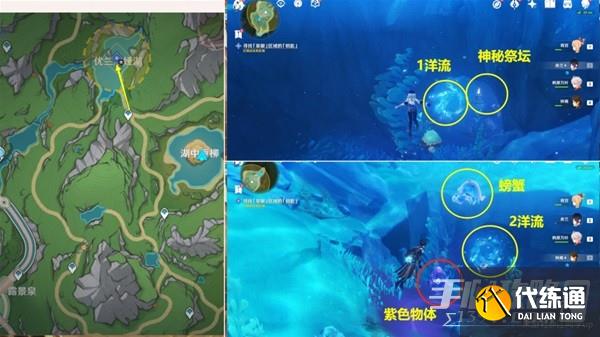 (2)傳送到下圖位置,去水下完成解密,先從1洋流這里傳送一下,會到2洋流位置,然后獲得螃蟹的【盾反】能力,長按E技能,等2洋流這邊的【紫色物體】打我們的時候,利用【盾反】打掉【紫色物體】,然后再從2洋流傳送回到1洋流那邊去