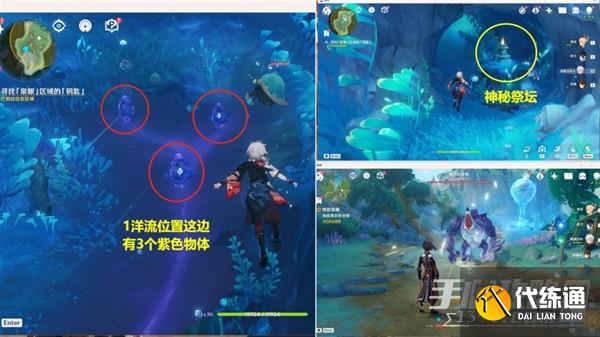 (3)回到1洋流這邊,1洋流這邊還有3個【紫色物體】,再利用【盾反】打掉這3個【紫色物體】過完劇情動畫后,再去【調查】一下【神秘祭壇】,然后我們會被傳送到岸上,再打掉出現的龍蜥后,獲得第3個【淚滴之鑰】后,該階段任務結束