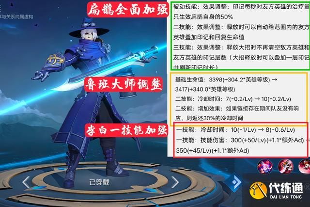 由于本次是大版本更新,所以帶來的英雄調(diào)整比較多,將會(huì)有9位英雄都會(huì)面臨屬性調(diào)整,首先扁鵲迎來了一個(gè)全面加強(qiáng),被動(dòng)技能和二技能、三技能都迎來了新的效果,新賽季扁鵲上分應(yīng)該是比較穩(wěn)的。魯班大師坦度增加,但是二技能的冷卻時(shí)間卻進(jìn)行了增加,整體來看是個(gè)小削弱。李白一技能冷卻時(shí)間降低傷害增加,刮痧李師傅地位逐漸正在回溫。