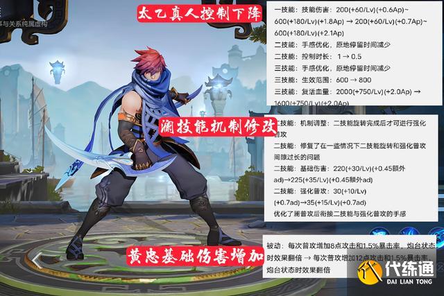 太乙真人在調(diào)整之后,一技能的技能傷害進(jìn)行增加,但是二技能的控制技能直接降低到0.5秒,控制能力大幅度下降,三技能的復(fù)活血量也進(jìn)行了下調(diào),不過好在作為平衡大招生效范圍進(jìn)行了增加。瀾在新賽季更新之后,技能機(jī)制全部修改,想要無限連已經(jīng)不可能了,作為補(bǔ)償增加了二技能的傷害和手感。黃忠的被動(dòng)普攻攻擊力進(jìn)行小幅度增加,也算是略微提升一下黃忠的熱度,畢竟現(xiàn)在在射手英雄中,黃忠的地位還是比較低的。