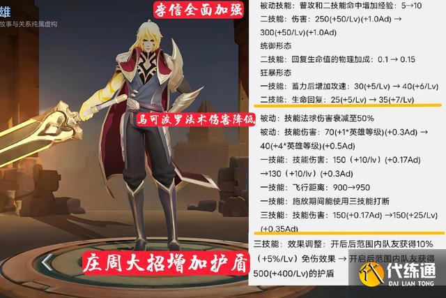 李信迎來了全面加強(qiáng)的,優(yōu)化了bug,并且所有技能全部都有小幅度的提升,新賽季想要使用李信上分的玩家又可以拿出來了。馬可波羅被動(dòng)法球效果傷害削弱一半,雖然對一技能和三技能的傷害進(jìn)行了增加,但是需要補(bǔ)足輸出裝才能夠有傷害,更加考驗(yàn)馬可波羅的生存環(huán)境了。莊周的大招進(jìn)行調(diào)整,把免傷效果改成了增加護(hù)盾,這種看得著的保護(hù)機(jī)制,或許能夠改變莊周目前毫無作用的地位。