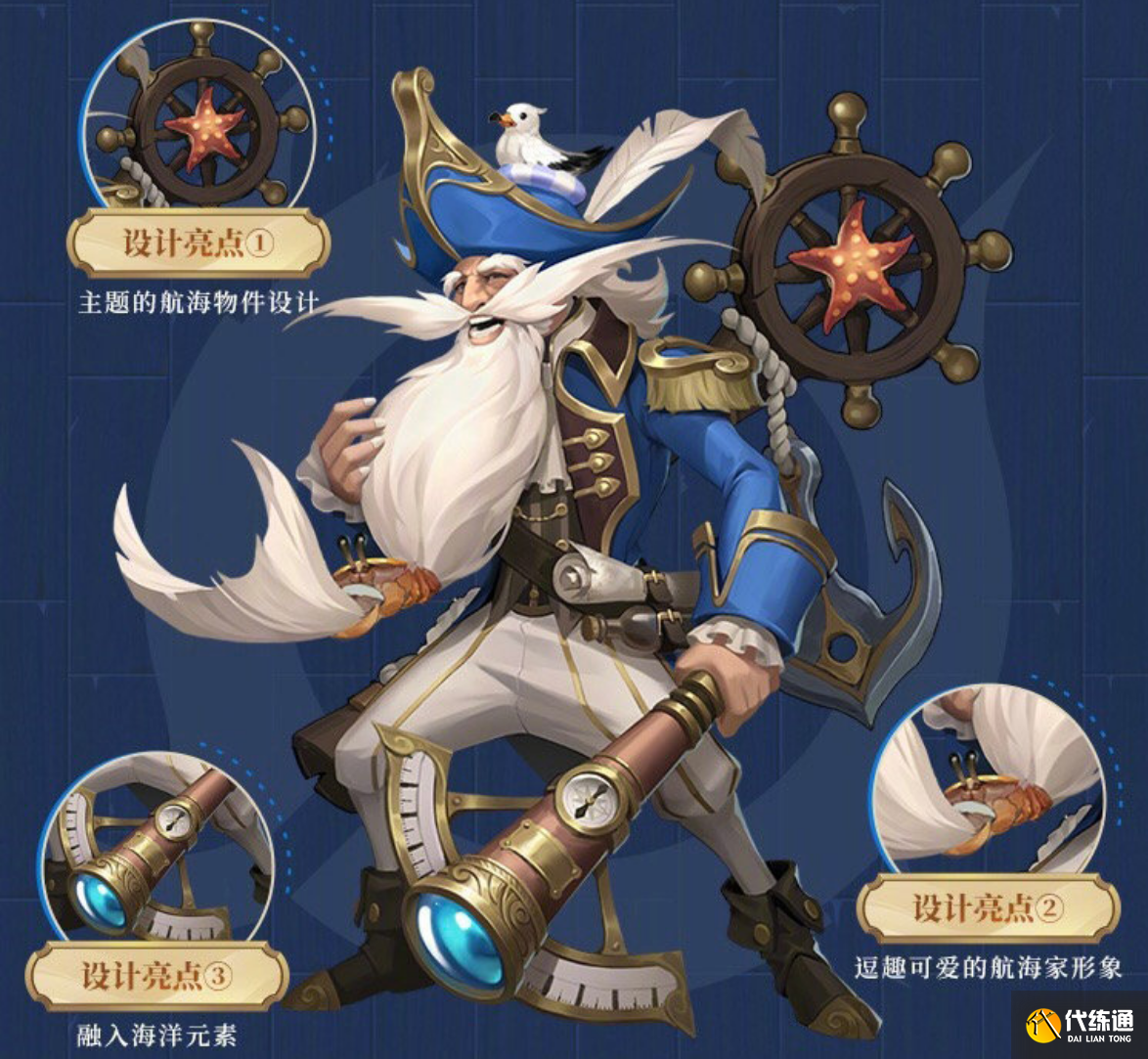 第二個,像一個釘耙的,這個其實是老夫子手里拿的望遠鏡的形狀啦,標志著進階版戰令80級的獎勵——老夫子的“航海奇遇記”皮膚。以海洋為主題的皮膚,老夫子還是第一個,老夫子本次化身為船長,帶領大家在王者峽谷里前行。這款皮膚繼承了80級戰令皮膚的精良制作,特效和音效都很不錯。
