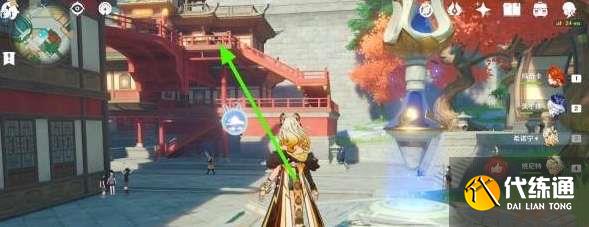 站在傳送錨點所在位置往小地圖西南方向看,可以看到紅色樓梯,沿著紅色樓梯往上走到達【萬文集舍】。