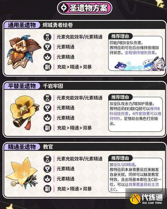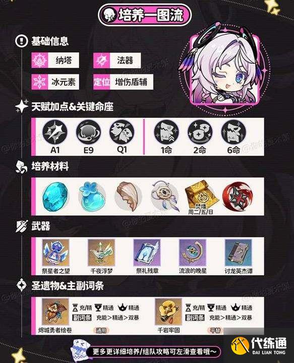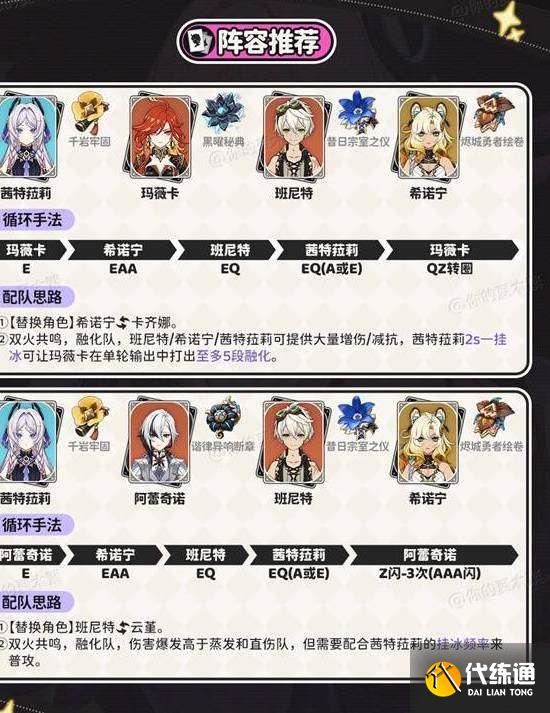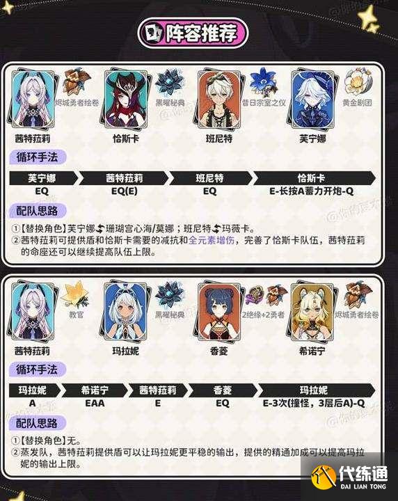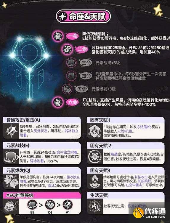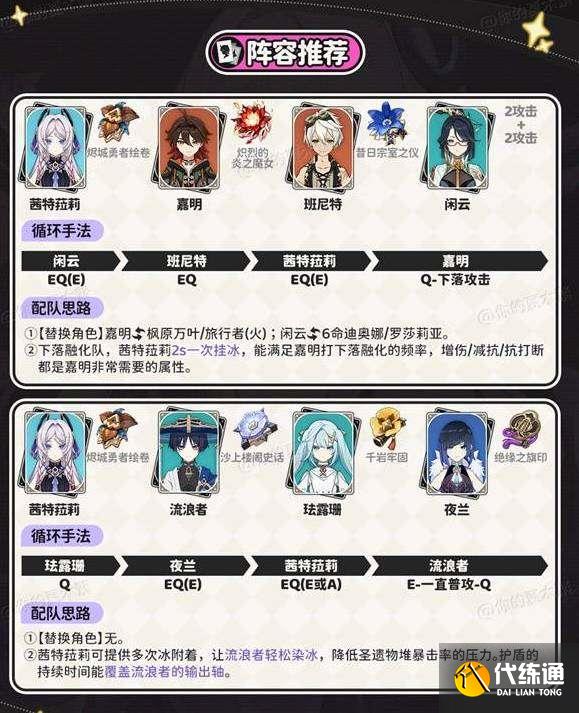茜特菈莉,0命機制完整,天賦提供火/水減抗,更重要是高頻的掛冰,為火C提供更高的傷害上限。同時茜特菈莉亦可作為盾輔進入各種隊伍。