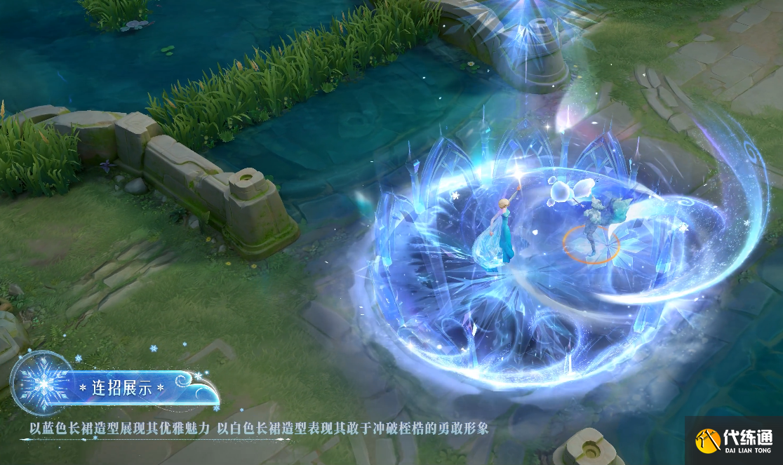 甄姬輕撫地面召喚出冰雪法陣,伴隨著《Let it go》經典旋律,水珠升起幻境。幻境中的她裝扮回艾莎的藍色禮服,召喚出了夢中的城堡。她不再像從前那般壓抑,輕快得邁上冰雪搭建的階梯,奔向了城堡的門外……