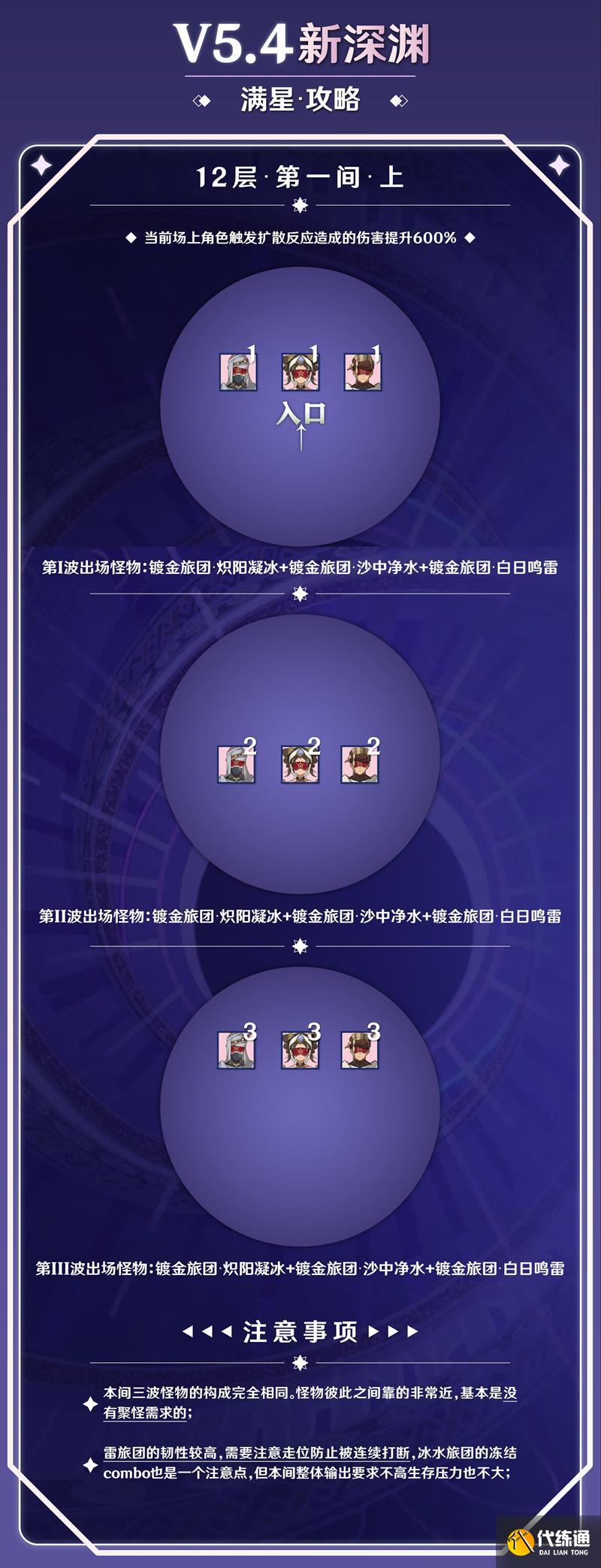 上半部分為三波鍍金旅團,每波包含冰、水、雷三種屬性的旅團成員。第一波刷新在身前,第二波刷新在身后,第三波刷新在第一波的位置。怪物站位密集,無需額外聚怪。雷旅團的血量稍厚(68萬),冰水旅團的凍結組合需要注意,但整體輸出和生存壓力不大。雷旅團韌性較高,容易打斷旅行者,需要注意走位躲避。
