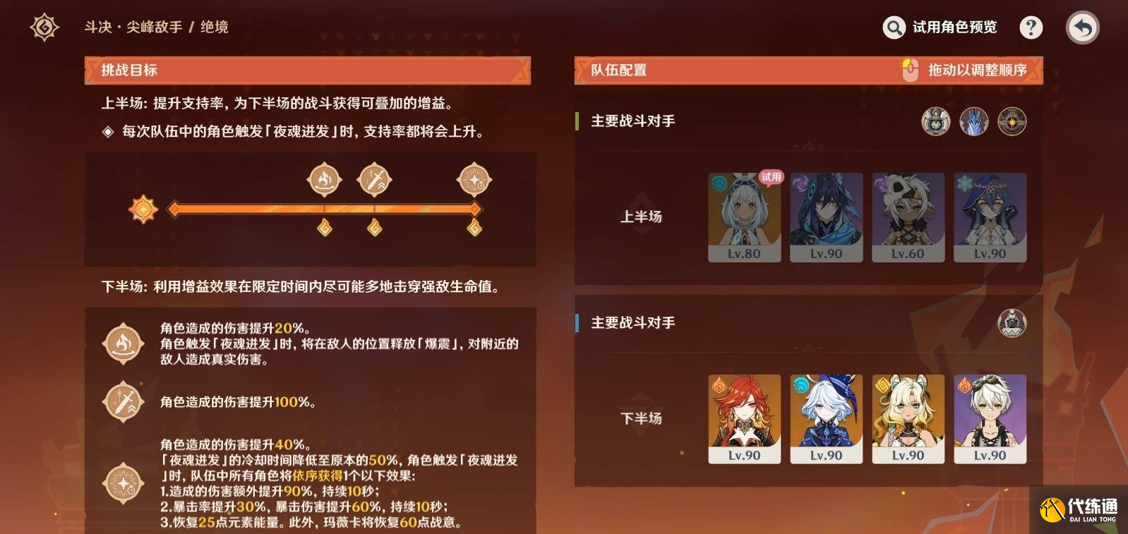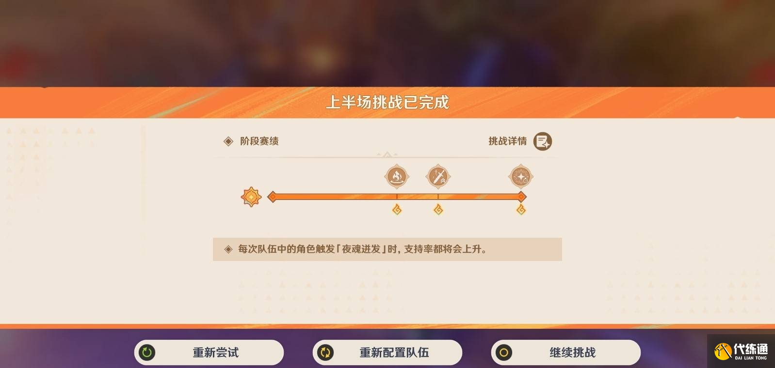 注意:下半場可以在繼承上半場支持率的基礎(chǔ)上重新挑戰(zhàn),無需再次打上半場。挑戰(zhàn)失敗后,可以在隊伍配置界面直接更換陣容。如果想重新挑戰(zhàn)上半場,點擊界面下方的“重置挑戰(zhàn)進度”即可。