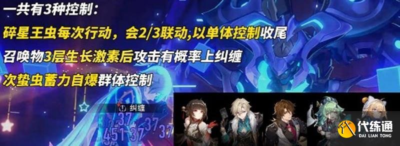 在挑戰碎星王蟲時,首先要了解其屬性弱點,其屬性為“物理等于虛數,大于冰,大于火”。碎星王蟲本身擁有這四個弱點,但其召喚的小蟲有兩種:大量的“物冰虛數”蝕蟄蟲與少量的“物火虛數”次蟄蟲。因此,多消滅敵方召喚物是關鍵,觸發其亡語效果可以扣除敵方群體生命值,同時削減首領韌性條。碎星王蟲速度不快,但每次行動都會對單體角色造成高概率的糾纏控制效果。所以,攜帶解控、免控或提高抗性角色非常重要。推薦攜帶靈砂、砂金、加拉赫、藿藿、符玄、星期日、布洛妮婭等角色。若沒有這些角色,也可以選擇buff2來提高50%效果抵抗。