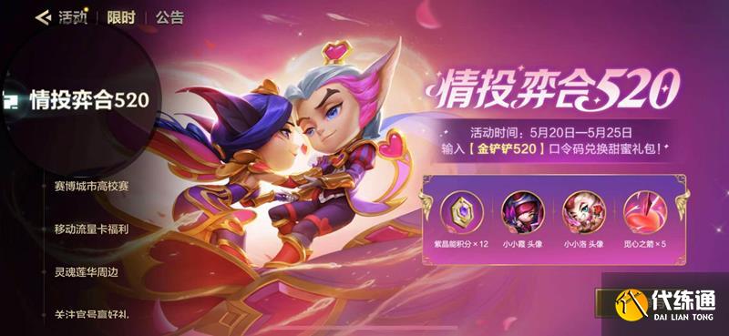 5月20日10點起至5月25日24點,前往游戲內-事件中心-限時-情投弈合520,通過口令碼【金鏟鏟520】兌換甜蜜禮包快來參與吧!