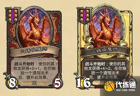 · 改動前:7/5。戰斗開始時:使你的龍獲得+2/+1。在你施放1個酒館法術后,提升此效果。
