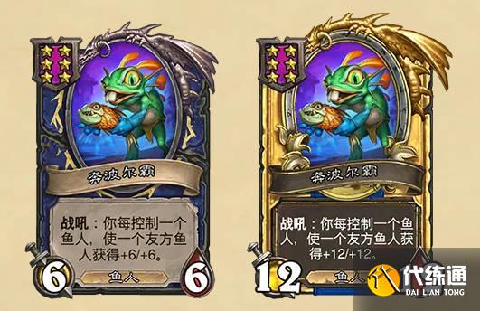 · 改動后:6/6。戰吼:你每控制一個魚人,使一個友方魚人獲得+6/+6。