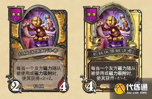 · 改動后:2/4。每當一個友方磁力隨從被使用或磁力吸附時,使其獲得+2/+2。