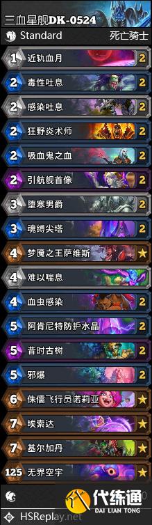 如果喜歡玩控制卡組的話,三血星艦DK是比較好的選擇。這套國服鉆到傳過去一天1000多場54.9%勝率。前5000里60多勝率。之前很難打的灌注獵現在不見蹤影,打現在最熱門的法師均勢到小劣,用來抓一抓茶壺卡組真的是不錯的選擇。