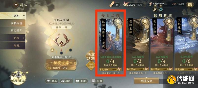 江湖風雨事(6人本),一天可以打一次,最多可以攢3天也就是3次一起打。這個副本沒啥要求,等級夠了就能打。