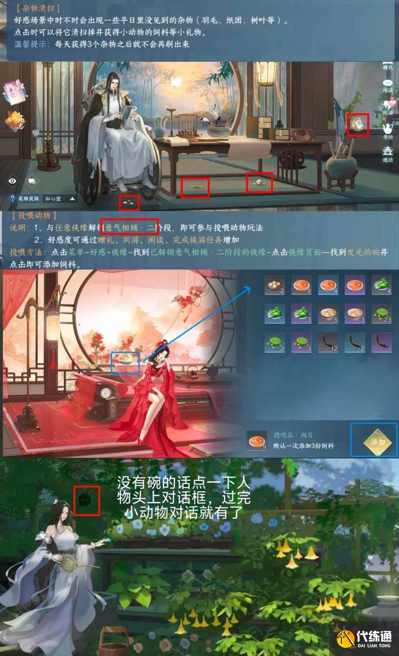 多次投喂飼料后和小動物會變熟悉,他會給你飼料和紫/紅/藍好感禮物作為贈禮