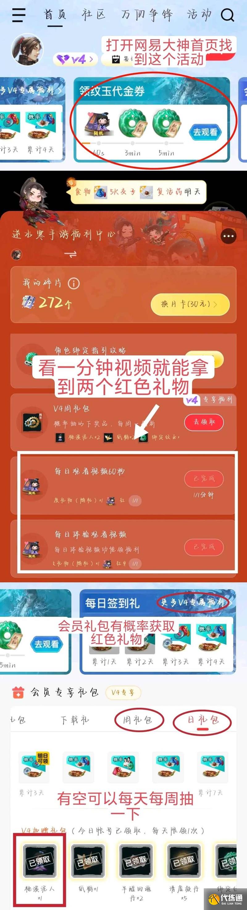 網易大神每天觀看一分鐘視頻可以獲得兩個紅色禮物,日禮包和周禮包也有機會獲得.