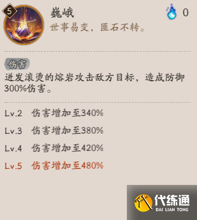 火山噴發,攻擊敵方全體3次,每次造成防御600%傷害(云間不見岳技能造成的單次傷害均不超過自身初始攻擊的20倍);攻擊后附加5層炙烤。首次施放后永久提升友方全體30%傷害。