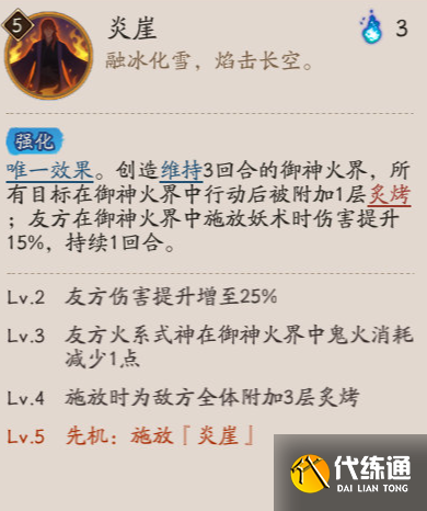 唯一效果。創造維持3回合的御神火界,所有目標在御神火界中行動后被附加1層炙烤;友方在御神火界中施放妖術時傷害提升15%,持續1回合。