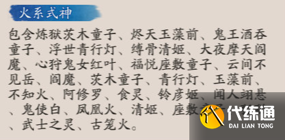 包含煉獄茨木童子、燼天玉藻前、鬼王酒吞童子、浮世青行燈、縛骨清姬、大夜摩天閻魔、心狩鬼女紅葉、福悅座敷童子、云間不見岳、閻魔、茨木童子、青行燈、玉藻前、不知火、阿修羅、食靈、鈴彥姬、聞人翊懸、鬼使白、鳳凰火、清姬、座敷童子、貍貓、武士之靈、古籠火。