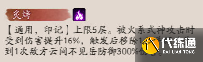 【通用,印記】上限5層。被火系式神攻擊時受到傷害提升16%,觸發后移除1層并額外受到1次敵方云間不見岳防御300%傷害。