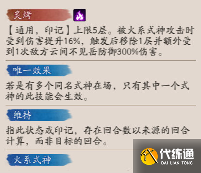 【通用,印記】上限5層。被火系式神攻擊時受到傷害提升16%,觸發后移除1層并額外受到1次敵方云間不見岳防御300%傷害。