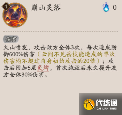 火山噴發,攻擊敵方全體3次,每次造成防御600%傷害(云間不見岳技能造成的單次傷害均不超過自身初始攻擊的20倍);攻擊后附加5層炙烤。首次施放后永久提升友方全體30%傷害。