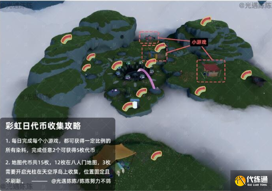 2.地圖代幣共15枚,12枚在八人門地圖,3枚需要開啟光柱在天空浮島上收集,位置固定且不刷新。