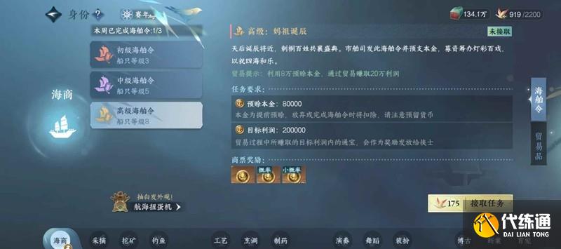 本周貿易可獲得96萬左右金幣,海舶令的利潤是隨機刷新的,我這周是20萬+20萬+50萬+6萬(3個高級1和中級)
