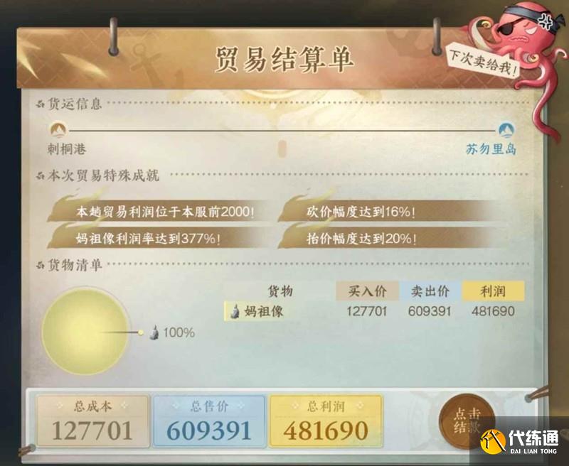 本周貿易可獲得225萬左右金幣,海舶令的利潤是隨機刷新的,我這周是高級海舶令25萬+100萬+100萬