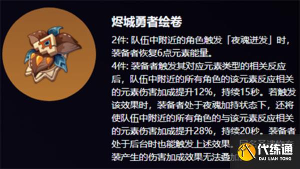 四件套效果:當裝備者觸發元素反應時,為相關角色提供15%元素傷害加成,持續10秒;若處于夜魂加持狀態下,該增傷效果可疊加至30%。