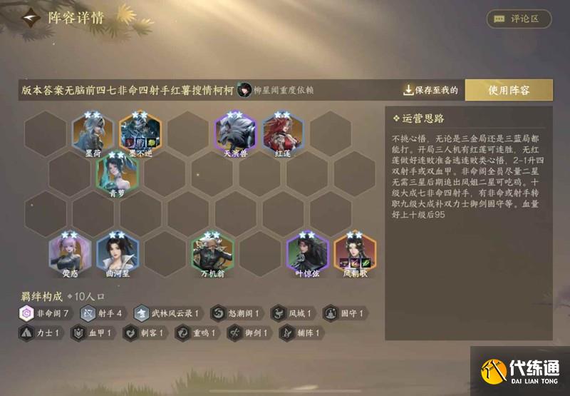 3.非命閣四射手(強度>四力四射)。四射完美彌補了非命閣缺后排主c的問題,七非命的大機甲也為四射提供前排,四力四射的升級版。但需要十人口,最好有個射手或非命轉九人口成型。前中后期都很強能一路高歌連勝上十找三星五費,唯一疲軟期是中后期d不出墨不逆和鳳君湊不出七非命和四射手,找到了就能繼續高歌猛進。