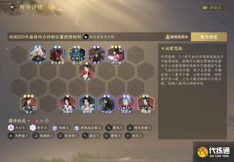 2.鳳城。三個注意的點,1開局人機就給三鳳才能玩道理同初涉江湖。2連敗轉連勝的關鍵點,3-1或五十血就必須轉連勝,可以通過養連辛綁輔陣或射手羈絆力士羈絆轉連勝。3.開箱后淘汰低費鳳城卡轉型四力四射或二星鳳姐綁五輔。500層被迫開箱后不能一勞永逸,不轉型可能只能靠菜穩住一兩場然后寄