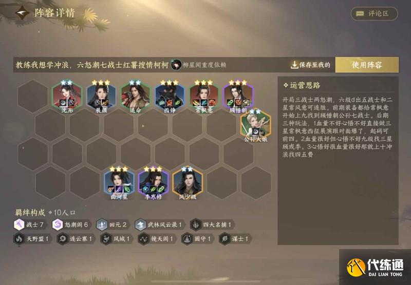 1.7戰士+怒潮閣/天野盟。前期主c常楓意展顏或西錚,后期主c顧惜朝或直接d三星五費,看心悟棋子轉職和血量的具體情況,決定是九級d三星四費顧惜朝季寒修等提棋子質量還是上十做三星五費