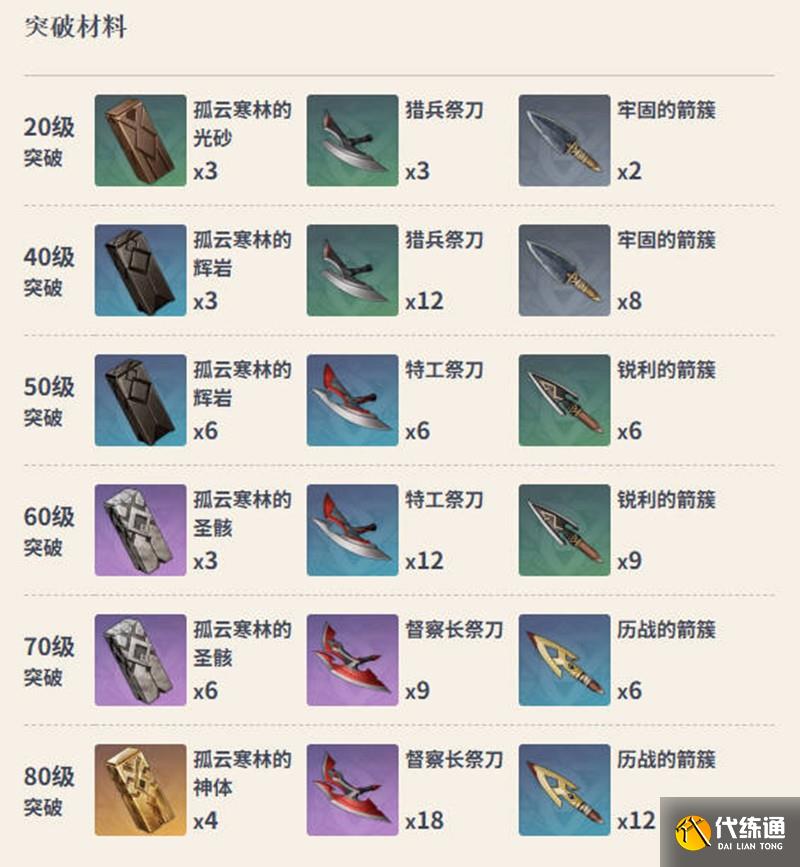 要將黑巖長劍突破到90級,需要準備大量突破材料。其中包括孤云寒林系列材料共25個,各類祭刀60把,以及不同品質的箭簇43個。這些材料主要可以通過擊敗愚人眾和丘丘人射手獲取,建議提前規劃好收集路線。