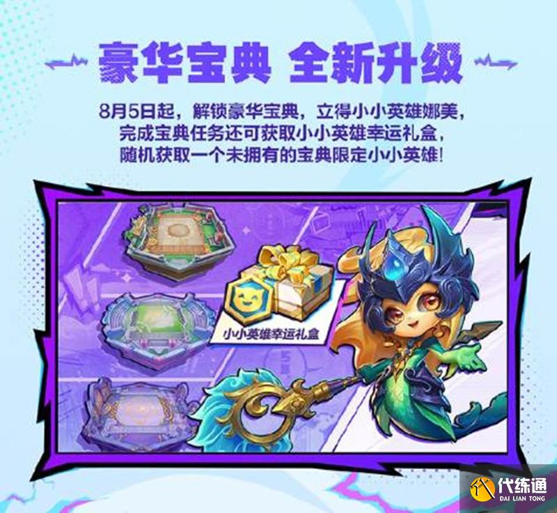 豪華寶典全新升級:8月5日起,解鎖豪華寶典,立得小小英雄娜美,完成寶典任務還可獲得小小英雄幸運禮盒,隨機獲取一個未擁有的寶典限定小小英雄!