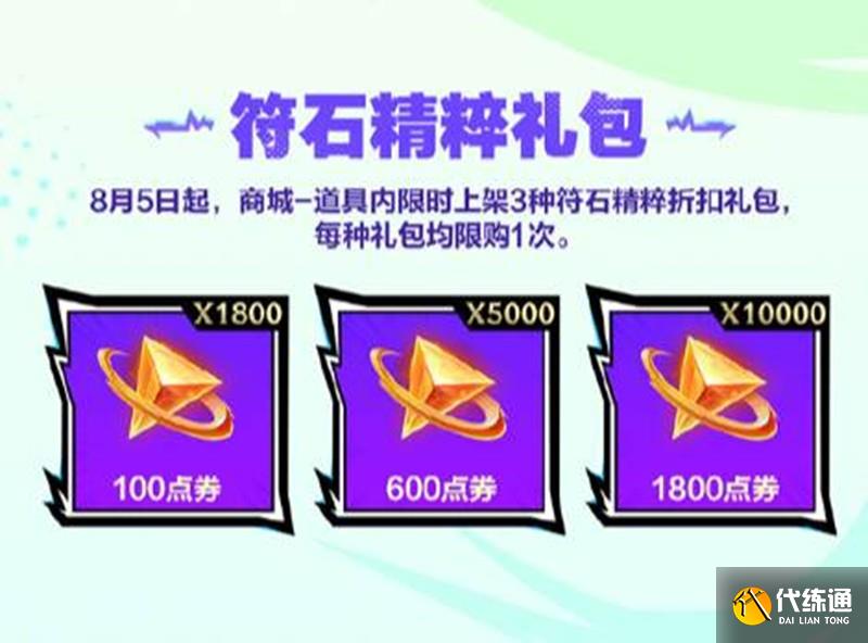 符石精粹禮包:8月5日起,商城-道具內限時上架3種符石精粹折扣禮包,每種禮包均限購1次。