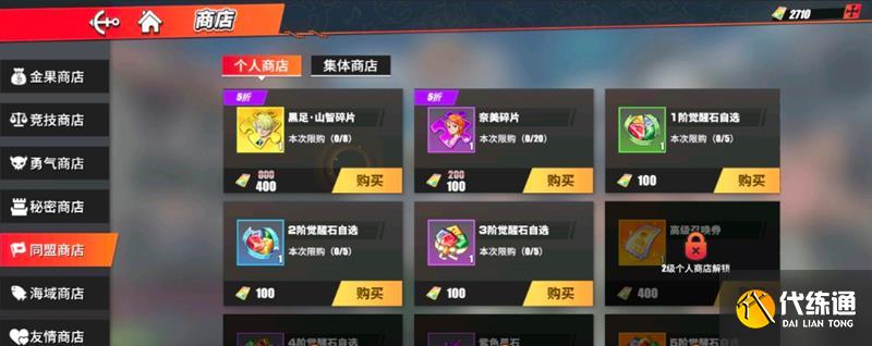 航海王熱血航線的同盟商店是獲取稀有道具的重要途徑,很多玩家發(fā)現(xiàn)商店里部分商品需要升級(jí)才能解鎖。商店買分為集體商店和個(gè)人商店兩種。個(gè)人商店是成員使用同盟貢獻(xiàn)值兌換物品的地方,而集體商店則是會(huì)長(zhǎng)或副會(huì)長(zhǎng)使用同盟資金購(gòu)買集體物資的場(chǎng)所。小伙伴們需要通關(guān)主線第四章第九個(gè)任務(wù)后就能開(kāi)啟同盟玩法,加入同盟后即可使用同盟商店功能。