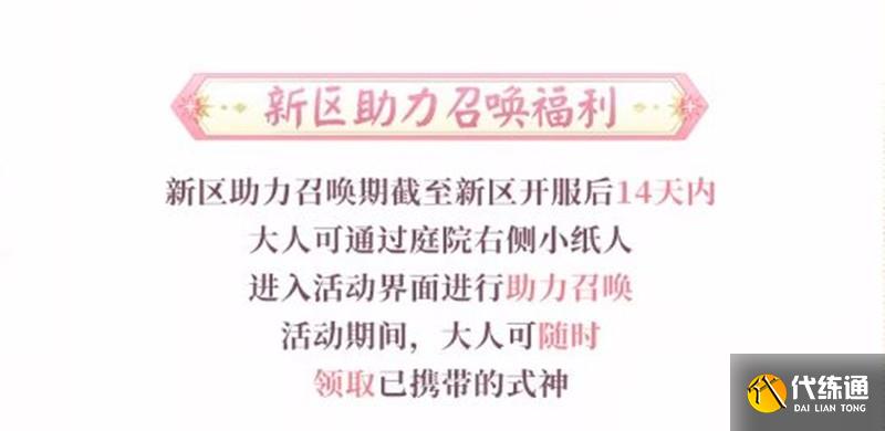 新區助力召喚期截至新區開服后14天內,玩家可通過庭院右側小紙人進入活動界面進行助力召喚。活動期間,玩家可隨時領取已攜帶的式神。