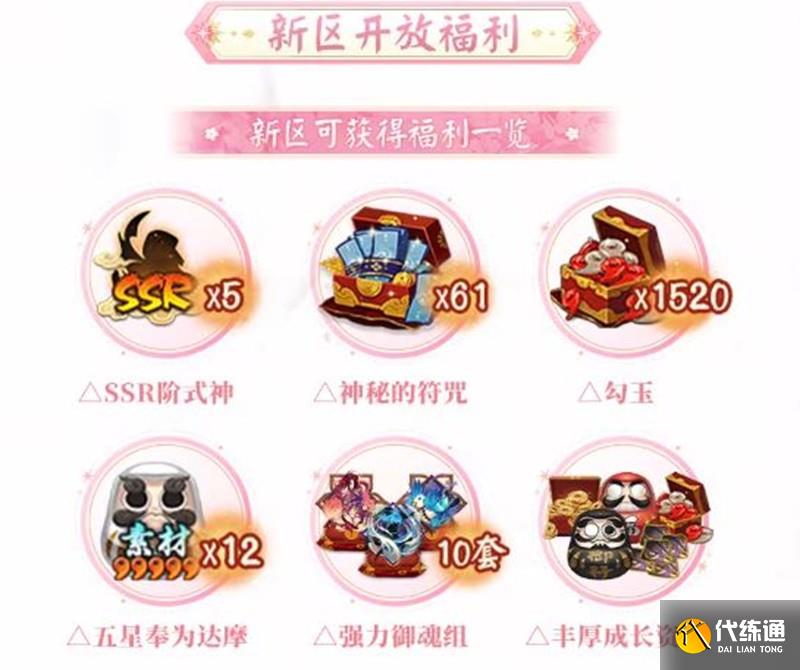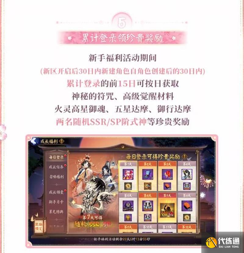 新區福利活動期間(新區開啟后30日內新建角色自角色創建后的30日內),累計登錄的前15日可按日獲取神秘的符咒、高級覺醒材料、火靈高星御魂、五星達摩、御行達摩兩名隨機SSR/SP階式神等珍貴獎勵。