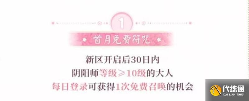 新區開啟后30日內,陰陽師等級≥10級的玩家每日登錄可獲得1次免費召喚的機會。