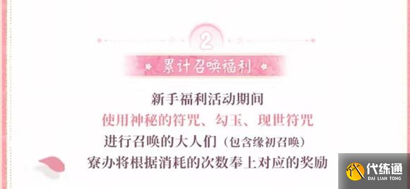 新手福利活動期間,使用神秘的符咒、勾玉、現世符咒進行召喚的大人們(包含緣初召喚)累計消耗對應次數將會分別獲得不同獎勵。獎勵包含指定范圍內自選SSR階式神、隨機SSR階式神、御行達摩、神秘的符咒及奉為達摩等。