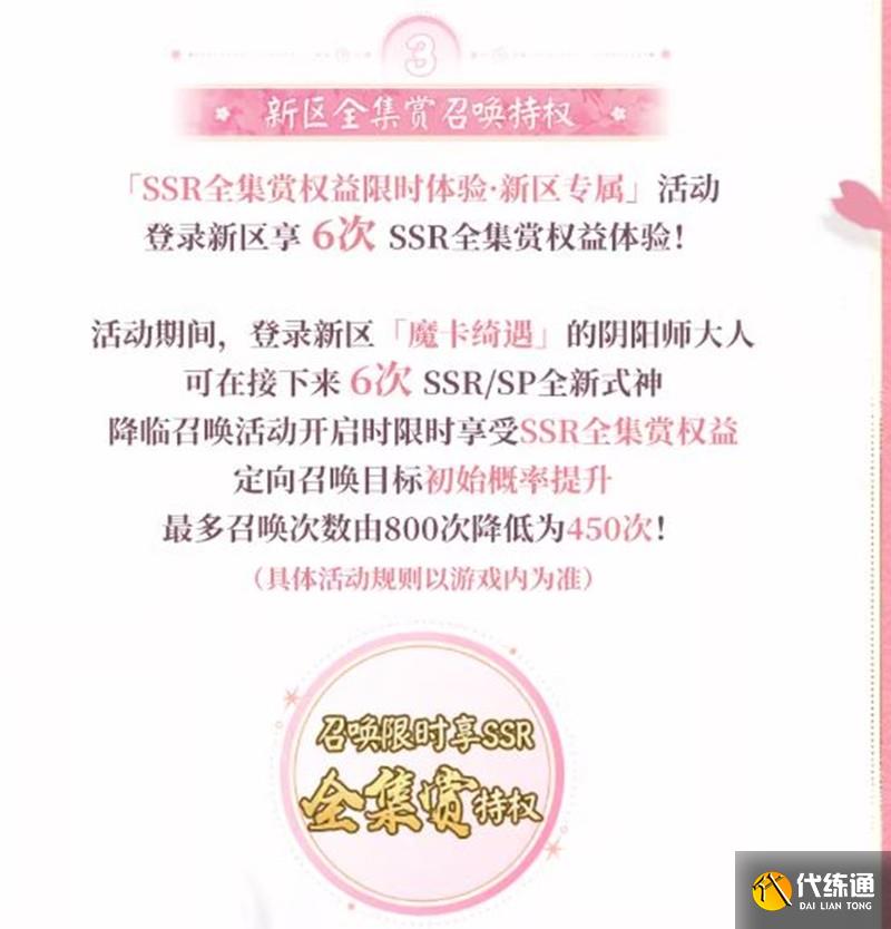 「SSR全集結權益限時體驗-新區專屬」活動,登錄新區享6次SSR全集結權益體驗!活動期間,登錄新區「魔卡綺遇」的陰陽師大人可在接下來6次SSR/SP全新式神降臨召喚活動開啟時享受SSR全集結權益,定向召喚目標初始概率提升,最多召喚次數由800次降低為450次!