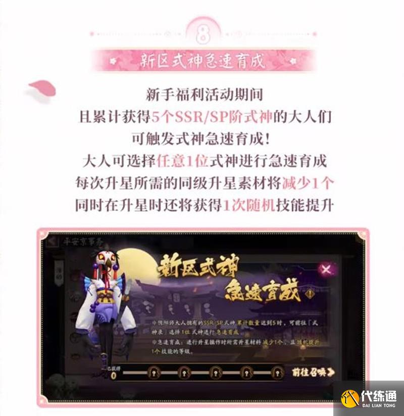 新手福利活動期間且累計獲得5個SSR/SP階式神的大人們可觸發式神急速育成!大人可選擇任意1位式神進行急速育成,每次升星所需的同級升星素材將減少1個,同時在升星時還將獲得1次隨機技能提升。