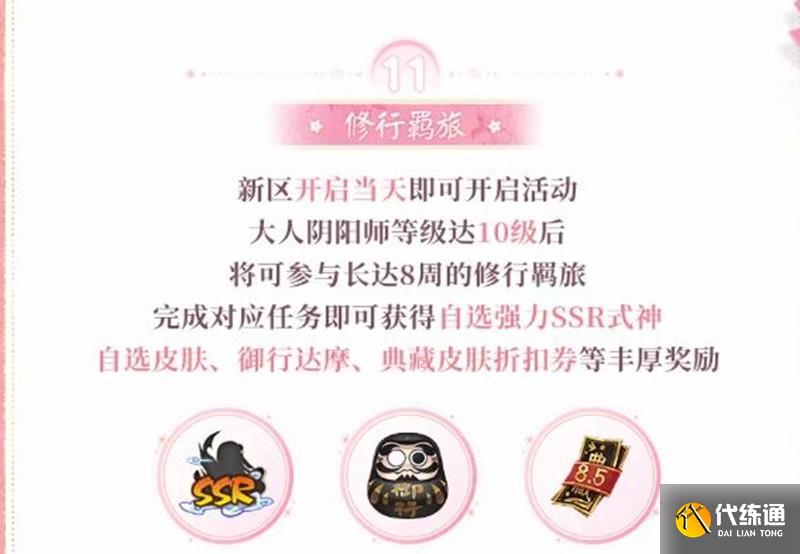 新區開啟當天即可開啟活動,大人陰陽師等級達10級后,將可參與長達8周的修行羈旅,完成對應任務即可獲得自選強力SSR式神、自選皮膚、御行達摩、典藏皮膚折扣券等豐厚獎勵。