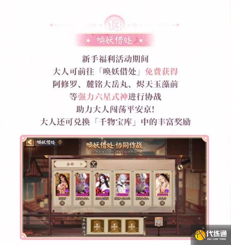 新手福利活動期間,大人可前往「喚妖借處」免費獲得阿修羅、麓銘大岳丸、燼天玉藻前等強力六星式神進行協戰,助力大人闖蕩平安京!大人還可兌換「千物寶庫」中的豐富獎勵。