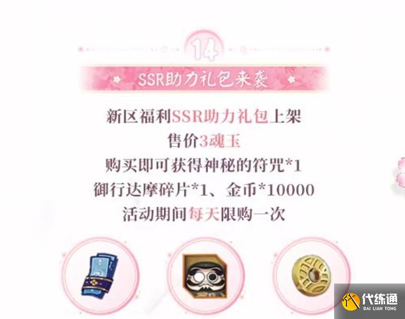 新區福利SSR助力禮包上架,售價3魂玉,購買即可獲得神秘的符咒1、御行達摩碎片1、金幣*10000,活動期間每天限購一次。